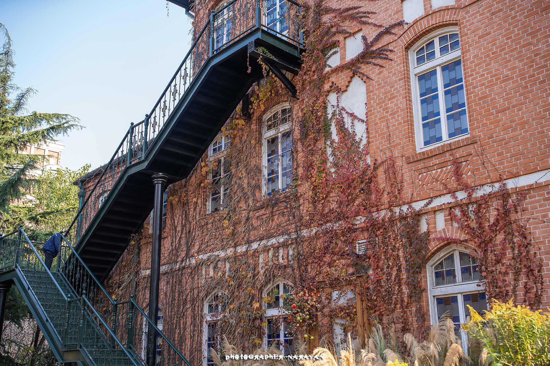 빨간 벽돌에 담쟁이 덩굴과 외부 계단의 색감의 조화가 정말 독특했습니다.
